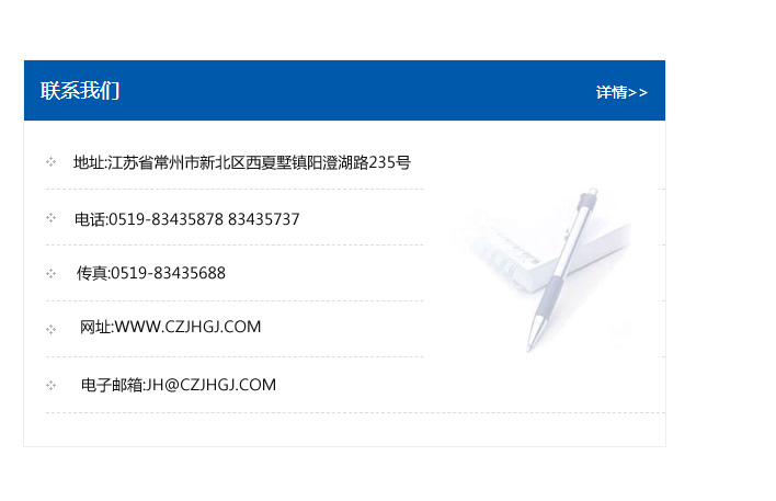 地址:常州市新北區友邦商務大廈1幢16、17層  電話:0519-85101652  傳真:0519-85112595  郵編:213022  網址:www.cz-jiayue_cn.qdshushijia.com  郵箱:xiajifengaa@163.com